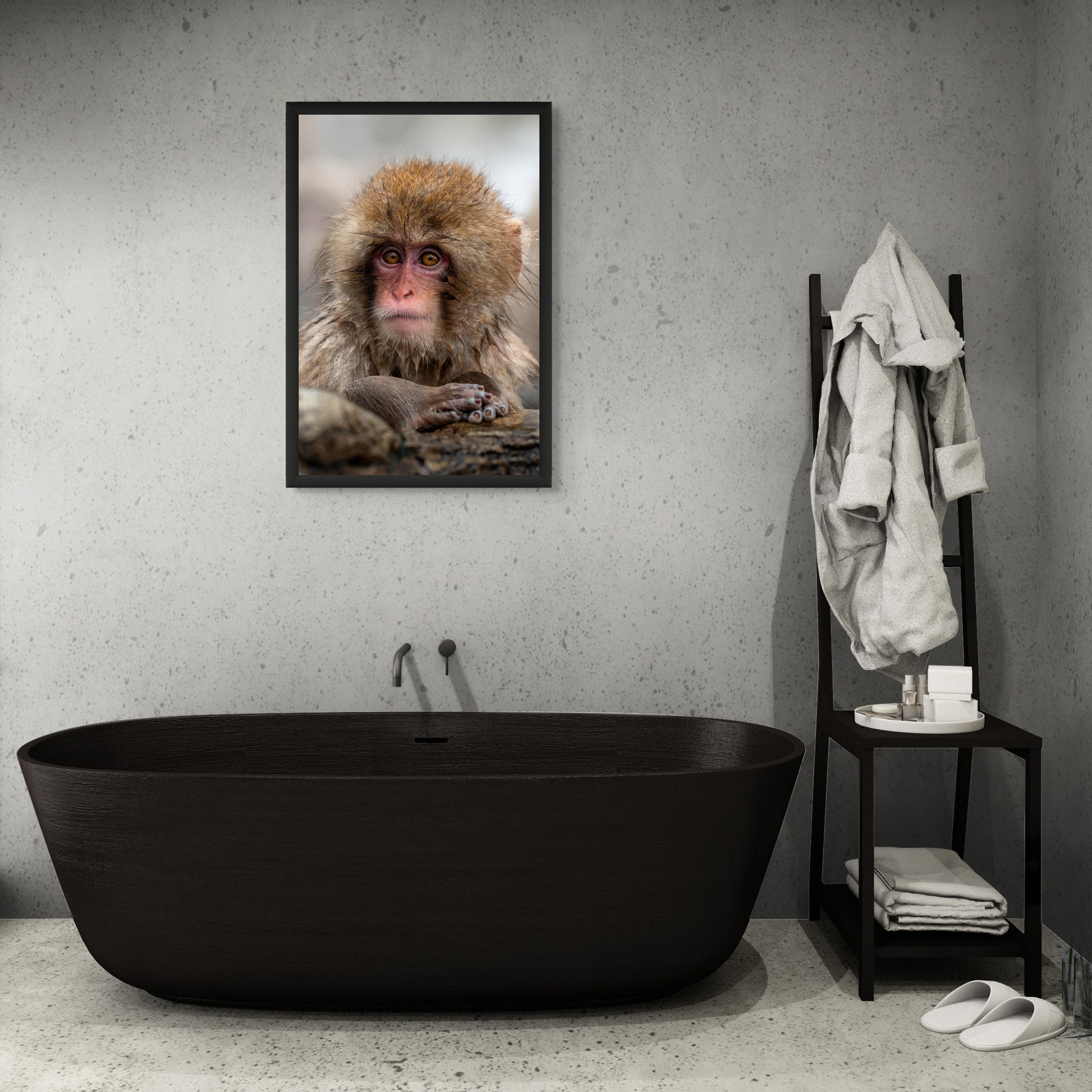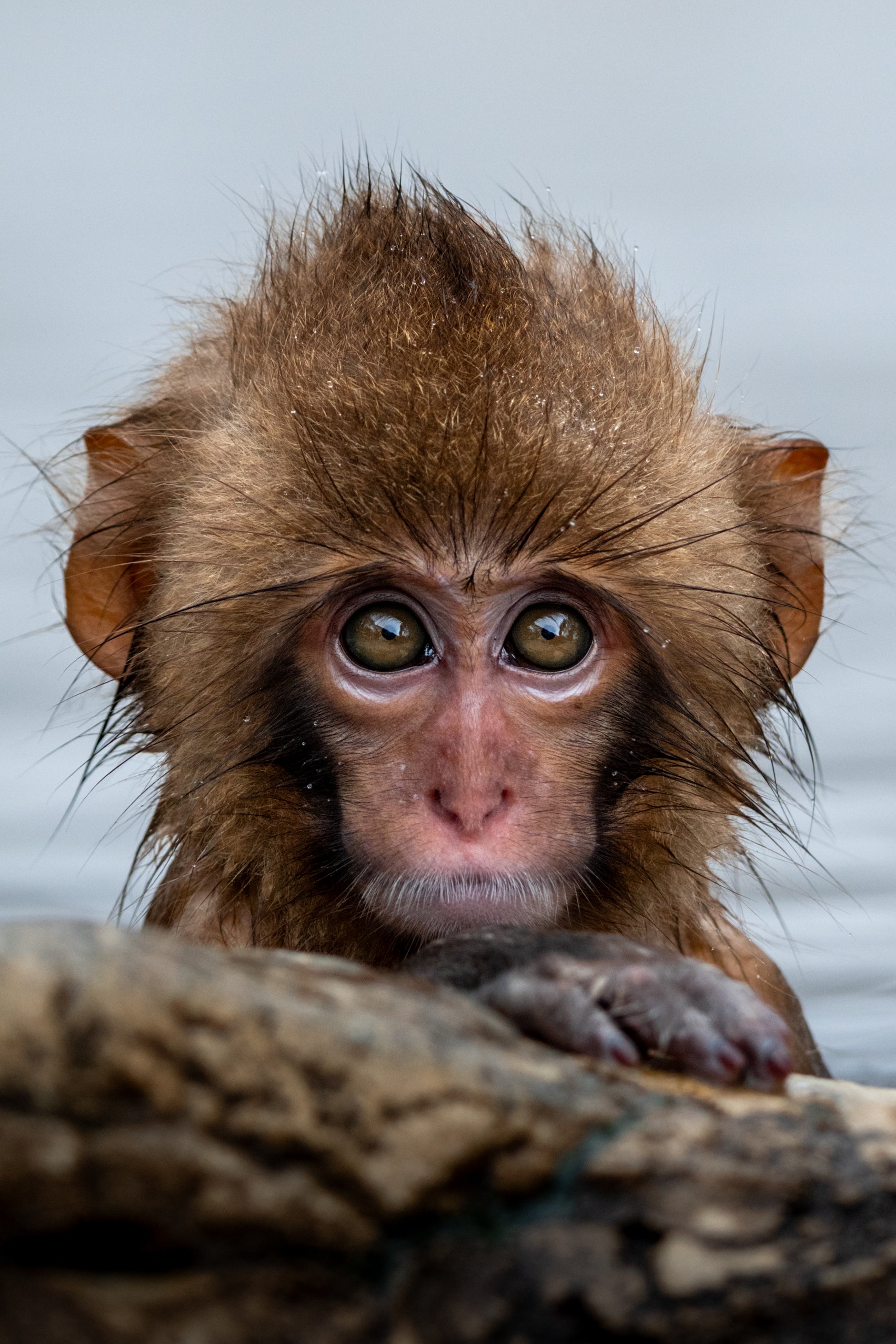 This close-up of a young Japanese macaque in Jigokudani captures more than just a curious animal - it captures a soul. With wide, expressive eyes and wet fur clinging to its tiny frame, the baby monkey stares directly at the viewer, bridging the gap between species with one look. The hot spring behind it steams softly, adding calm to the intensity of its gaze.